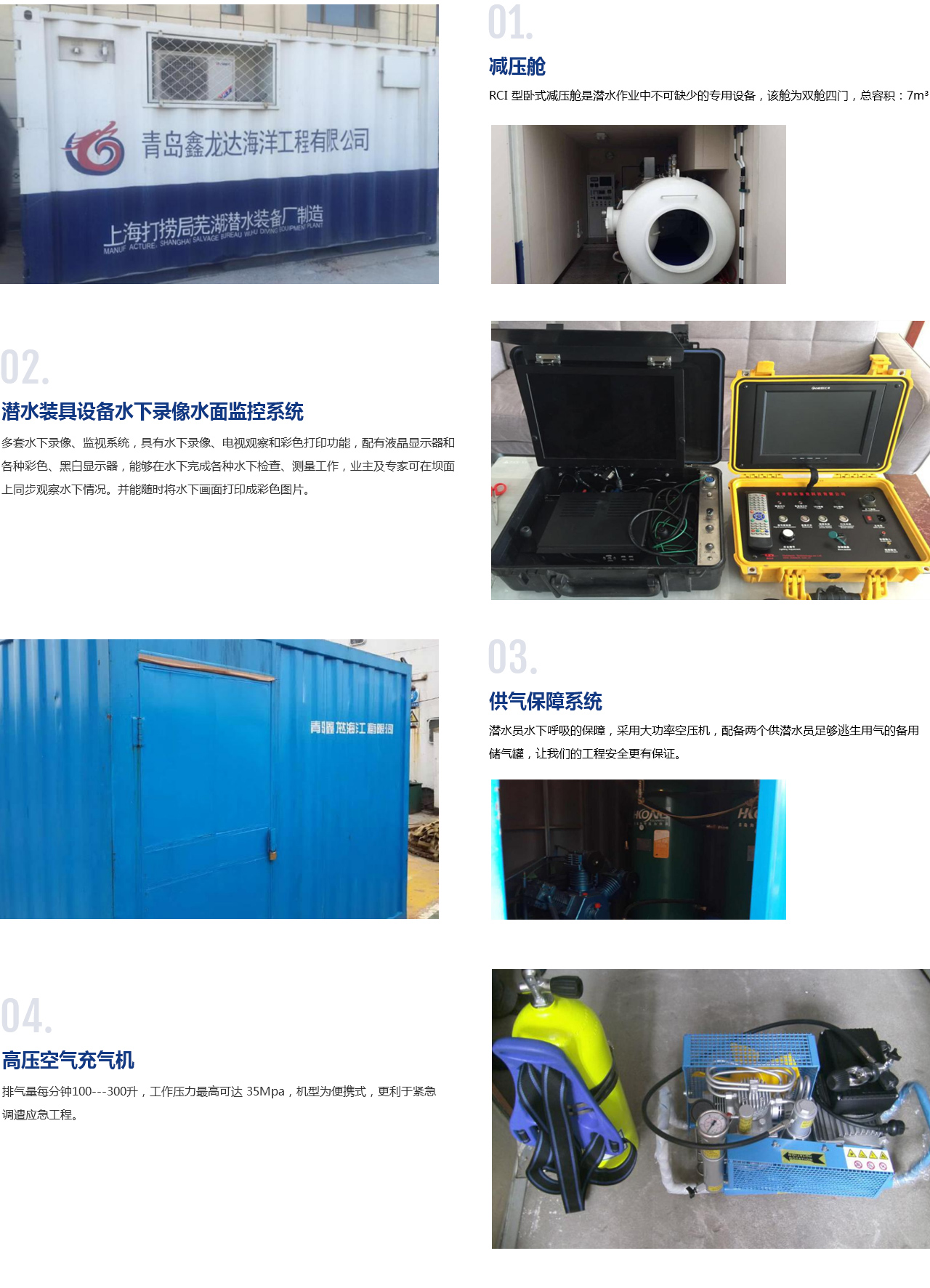 公司主要從事:水下工程設計與施工、潛水打撈、港口與海岸工程、防腐保溫工程、堤防工程、船舶污油水回收、潛水技術咨詢等。工程涉及到水下檢查及無損檢測、水下封堵、水下清理清淤、水下裂縫處理、水下切割、焊接、水下導管架拆除、水下海底電纜鋪設、水下沉船沉物探摸打撈、水下防腐、水下爆破、水下地形地貌及庫容勘察測量、水下構筑物澆筑以及病險壩水下補強加固等業(yè)務,多次在高海拔、大深度等惡劣環(huán)境下潛水作業(yè)。